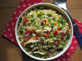 Coza o arroz em água temperada com sal. Leve uma frigideira anti-aderente ao lume com uma colher de azeite. Junte a cebola cortada em meias luas finas e deixe fritar até ficar dourada. Junte o pimento em cubinhos e o chouriço e deixe cozinhar mais um pouco. Tempere com um pouco de sal e pimenta. Reserve. Misture o arroz, o frango, o milho, as ervilhas com a cebola, chouriço e pimentos. Mexa bem e leve de novo ao lume para saltear mais um pouco. Sirva polvilhado com a salsa picada.